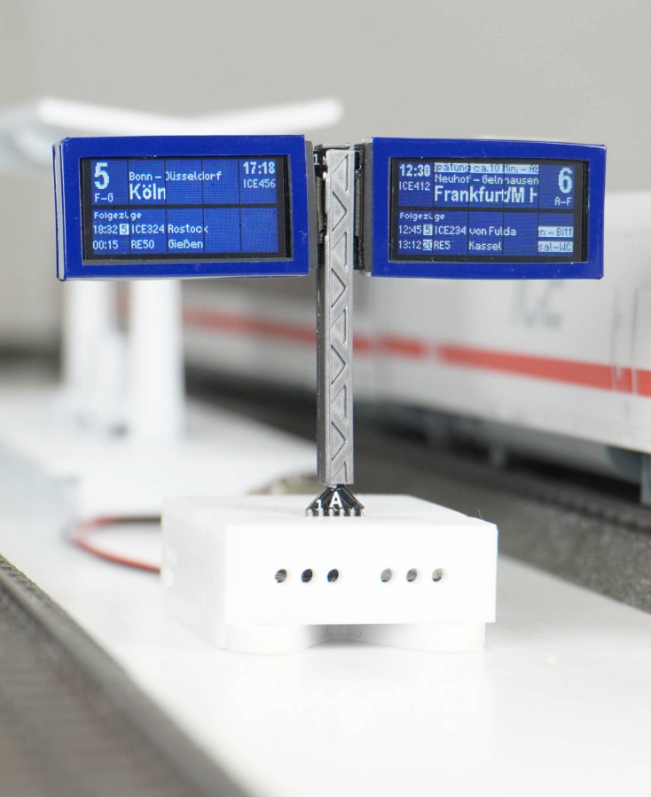 Verleihe deiner Modellbahnlandschaft in H0 mit meinem Zugzielanzeiger einen Hauch von Realität. Gib eigene Ziele, Abfahrtszeiten, Hinweise und Verspätungen an.